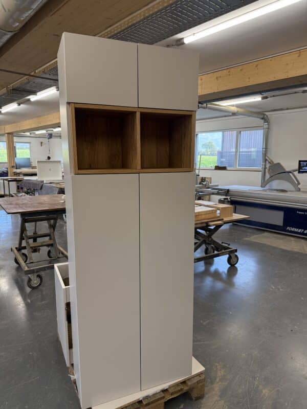 Bei Varianten mit Holz-Inlay wird das offene Fach als eigenständiges Modul mittig in den weißen Korpus eingesetzt. Die Außenwände bleiben durchgehend weiß, das Inlay sitzt innenliegend und konstruktiv eingebunden – keine aufgesetzte Blende, sondern eine bewusst integrierte Lösung mit sichtbarer Tiefe und klarer Architektur.