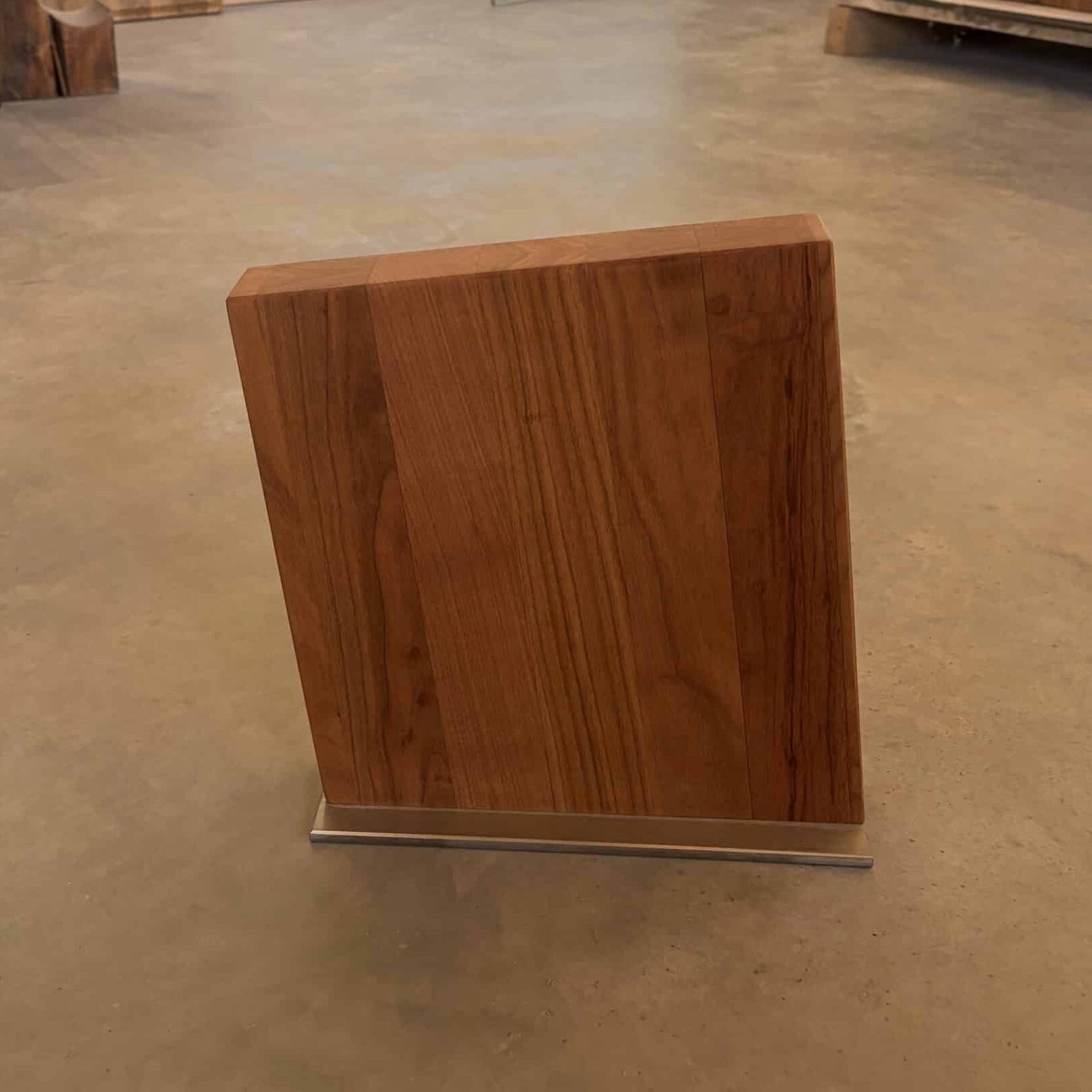 Maße: Holzblock 25 x 4 x 26/28 cm (LxBxH) – Edelstahlplatte 26 x 8cm 6mm Stärke