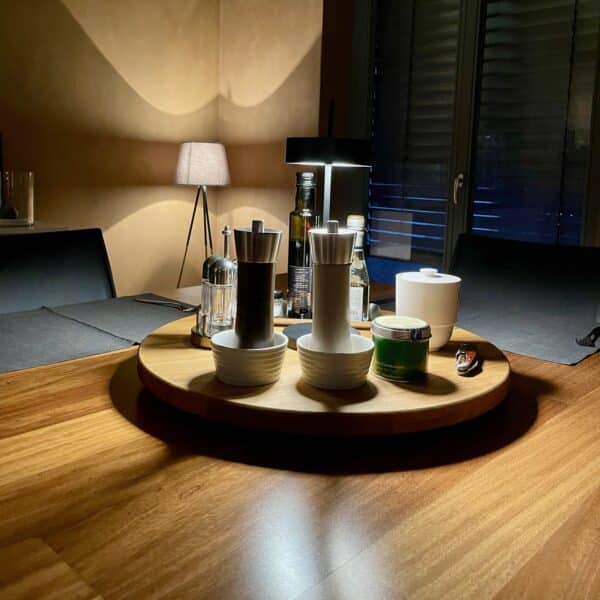Egal ob drehbare Tortenplatte, Pizza oder Käse & Wein Serviertablett, Küchentresen-Aufbewahrung für Gewürze, Essig & Öl, oder als Drehbuffet für die Tischmitte. Unsere drehbare Servierplatte aus Eichenholz ist nicht nur ein geschmackvolles Accessoire – sondern DAS Aufräum-Talent schlechthin.