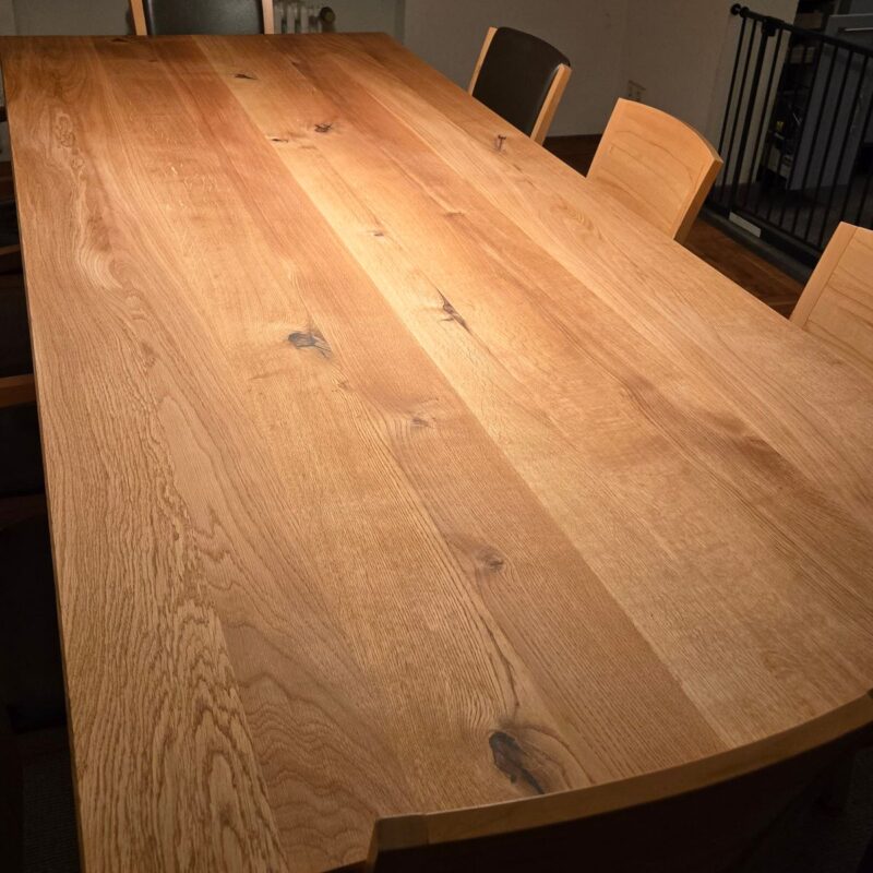 Dieser Esstisch aus massiver Eiche wird in unserer Manufaktur in Bayern nach Maß gefertigt. Die markante Maserung, das robuste Massivholz und eine natürlich geölte Oberfläche machen ihn zu einem zeitlosen Mittelpunkt für Alltag und Familie – gebaut für viele Jahre.