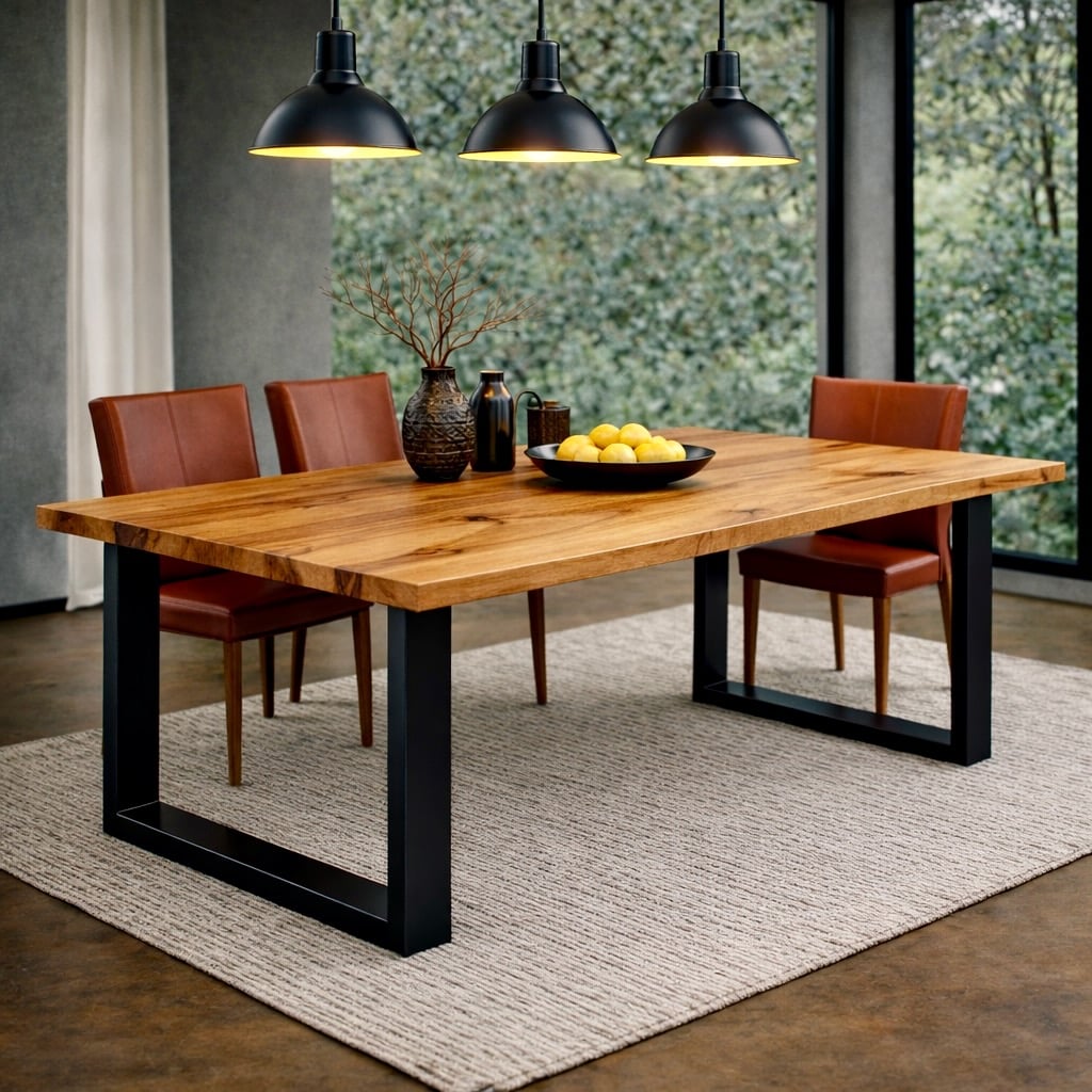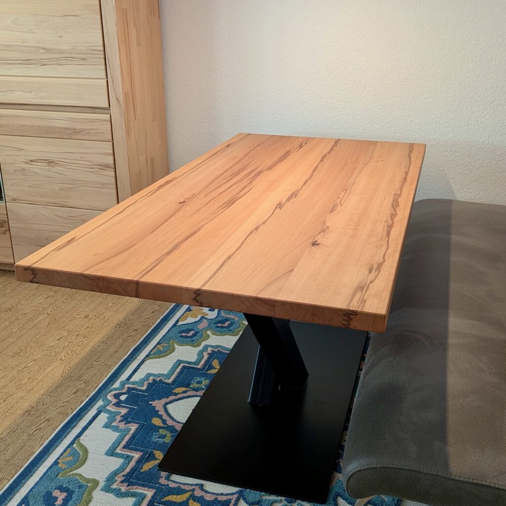 - Kufen-Gestell: 120–240 cm – luftig und modern, gut geeignet für Kernbuche mit lebendiger, aber ausgewogener Platte