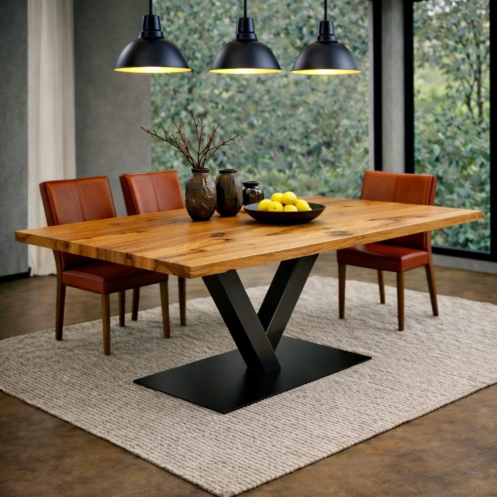 - V-Gestell: 140–220 cm – elegant und leicht, ideal wenn die lebendige Platte optisch etwas beruhigt werden soll