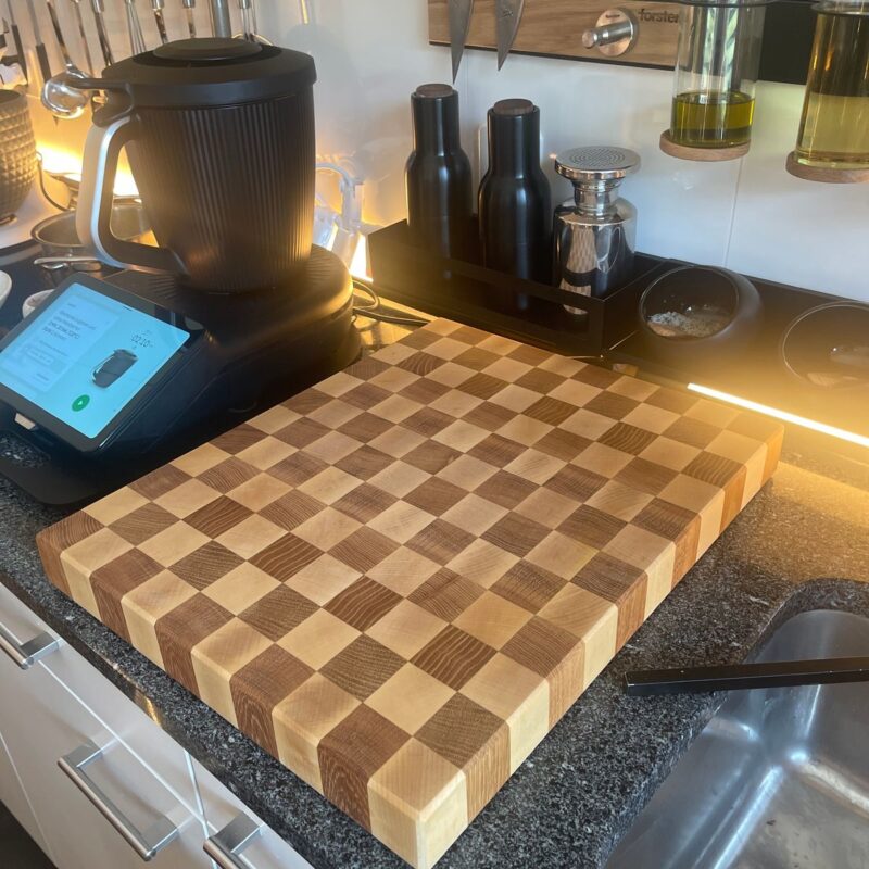 Die Königin 🔱 der Schneidebretter ist das Stirnholz Schneidebrett. Die Herstellung von Stirnholz Bretter ist dabei aufwendiger als bei klassischen Küchenbretter. Um ein Schachbrett Muster zu erzeugen, kommen Feinheiten in der Herstellung noch hinzu. Erst wenn Ecke auf Ecke sitzt, kommt ein tolles Gesamtbild zustande.