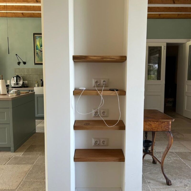 Da merkt man den Unterschied zu IKEA. Wir haben schwebende Eiche-Regalbretter in unterschiedlichen Dicken und Längen gekauft. Die Verarbeitung ist toll.